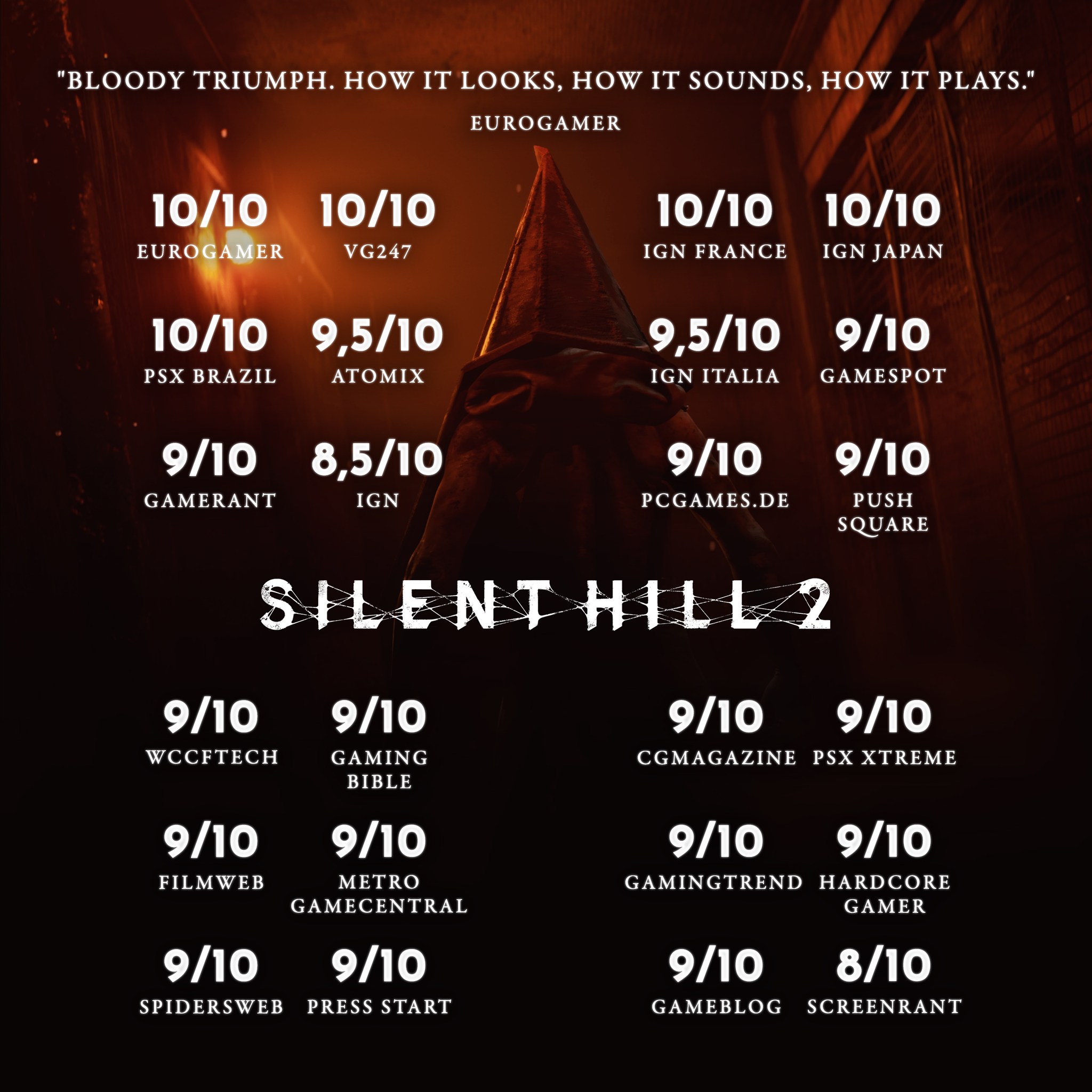 O lançamento de Silent Hill 2 aconteceu na última terça-feira (8) e, com ele, as primeiras impressões da imprensa especializada mundialmente. As notas circulam entre 87 e 88 pontos para um total de 100 em dois dos maiores agregadores de notas. Atualmente, no Metacritic, a nota média de Silent Hill é 86 sobre 73 análises. Já no OpenCritic, a nota média é 87 entre 67 análises.